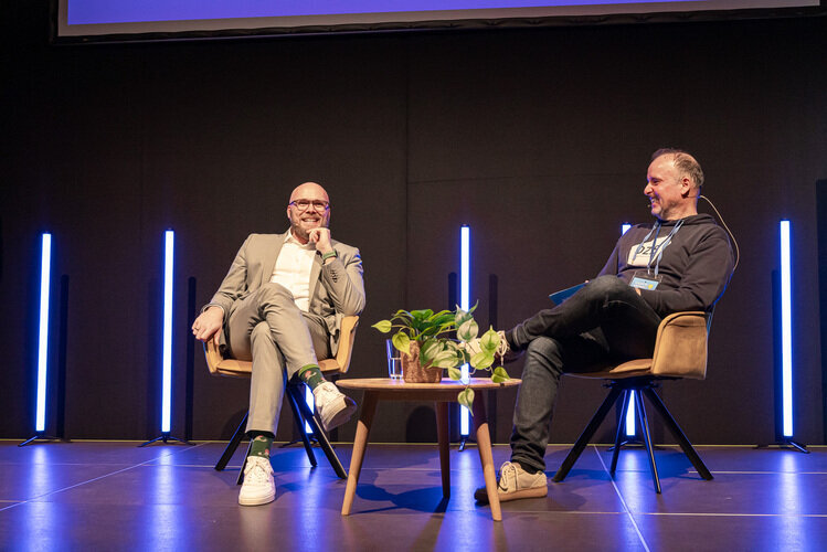 Nahezu fließend war der Übergang zum nächsten Highlight: dem Fireside Chat zwischen Dr. Fabian Mehring, Bayerischer Staatsminister für Digitales und Stefan Schimpfle .