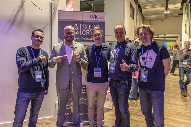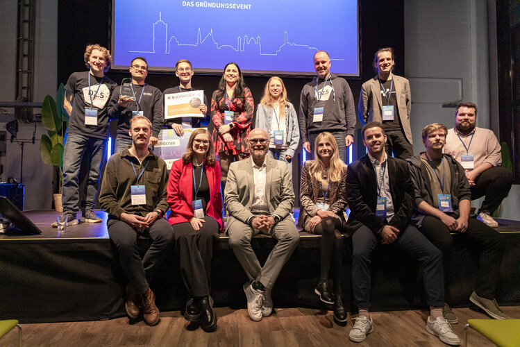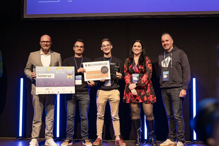 v.l.n.r.: Digitalminister Dr. Fabian Mehring, Jorginho Villar Guerrero, Paul Bittner (beide Solidcryo), Angelina Märkl (B4B), Stefan Schimpfle (DZ.S) bei der Siegerehrung I Bild: DZ.S
